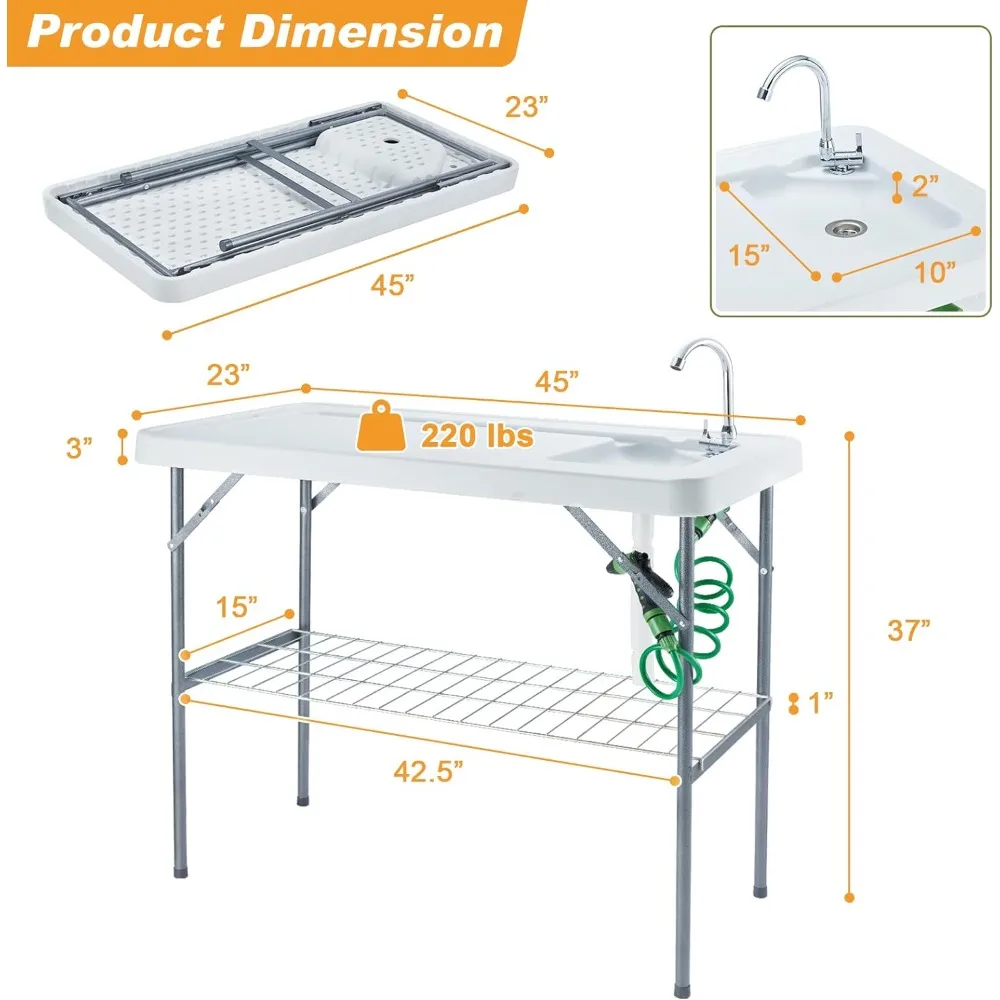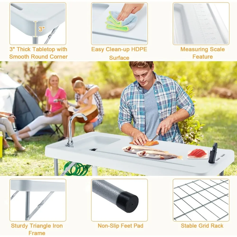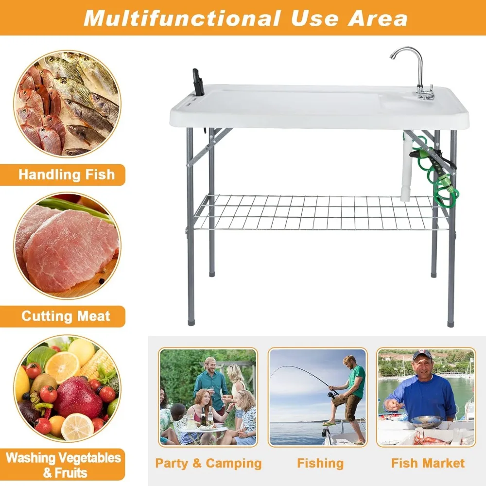 - 【MULTIPLE USAGE】Camping table with sink is perfect for picnic, camping, fishing and almost any kind of outdoor activity with family and friends. More importantly, this fish cleaning table can be widely used for cleaning different meats, fish, fruits and vegetables. Besides, our fish table is ideal for sellers to process and clean fish or meats.