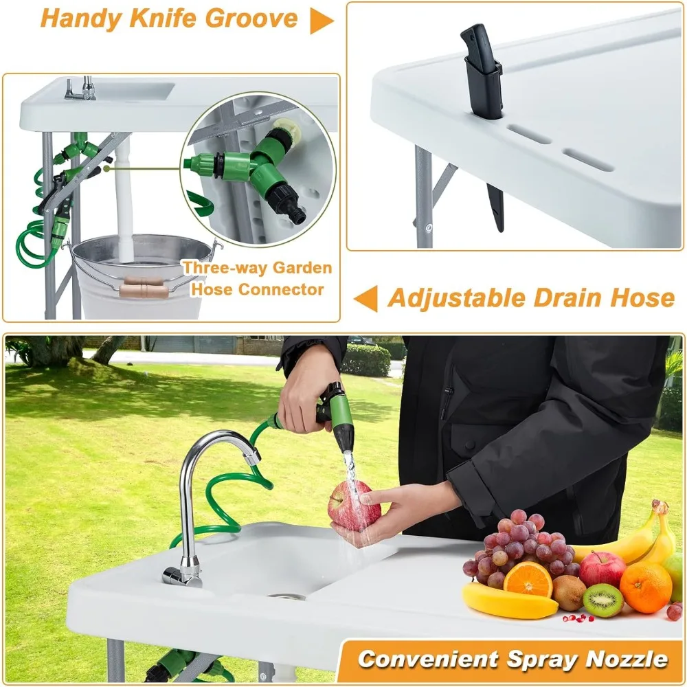 - 【Deepen Sink & Flexible Faucet】Our camping sink table is equipped with stainless steel faucet & three-way garden hose connector. Water faucet can be rotated and folded for flexible use and convenient storage. Telescoping drain hose can be adjusted from 15″-34″ to meet different requirements. In particular, the table has a built-in sink with drain plug, perfect for draining water, allowing you to wash fruit or vegetable.