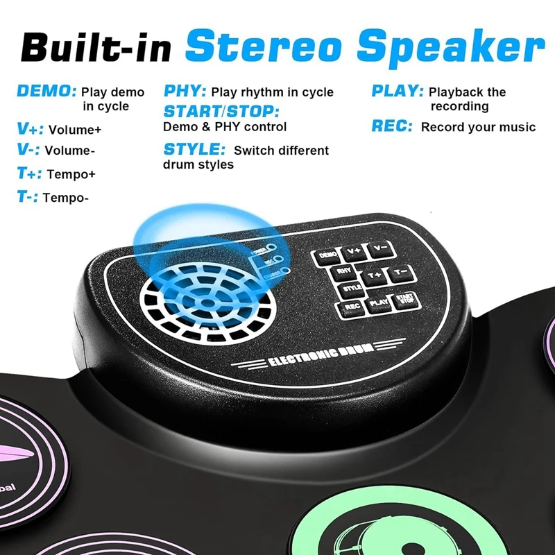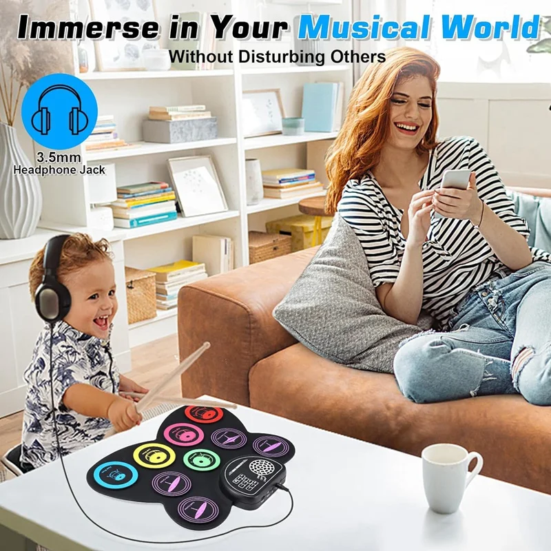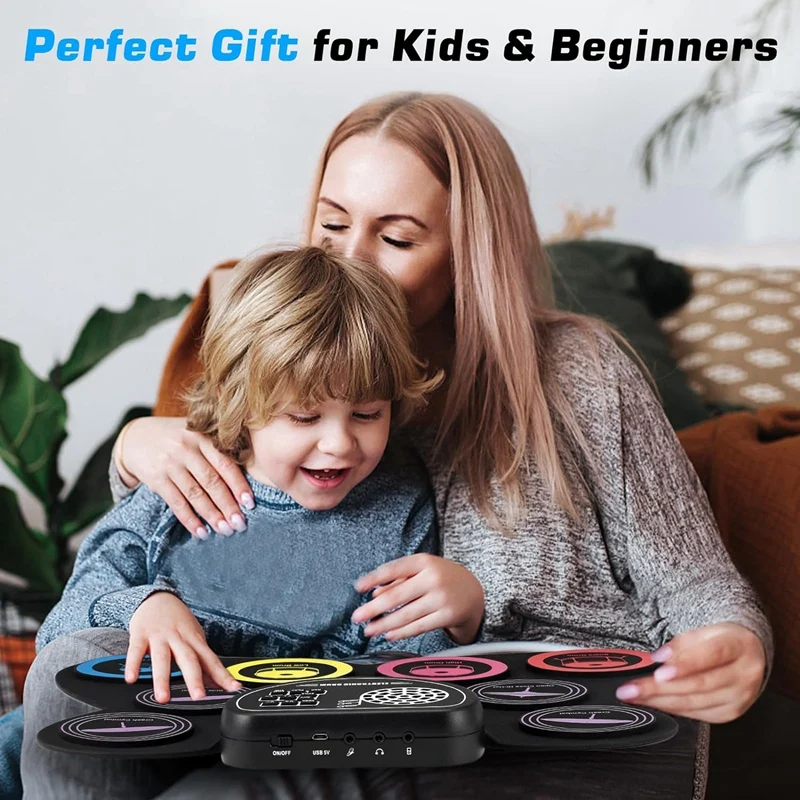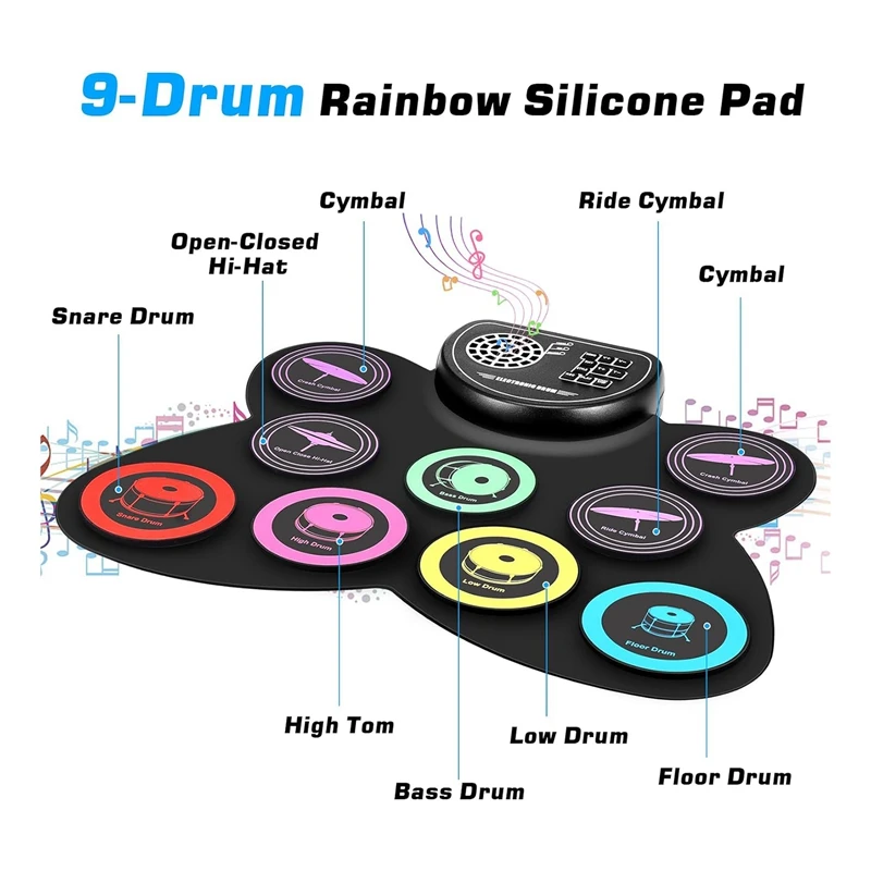 Perfect Gift for Kids/Beginners: The 9-drum electronic silicone rainbow pad is tailored to ignite musical passion among children and novices. An perfect gift choice for Christmas, birthdays, and holidays.