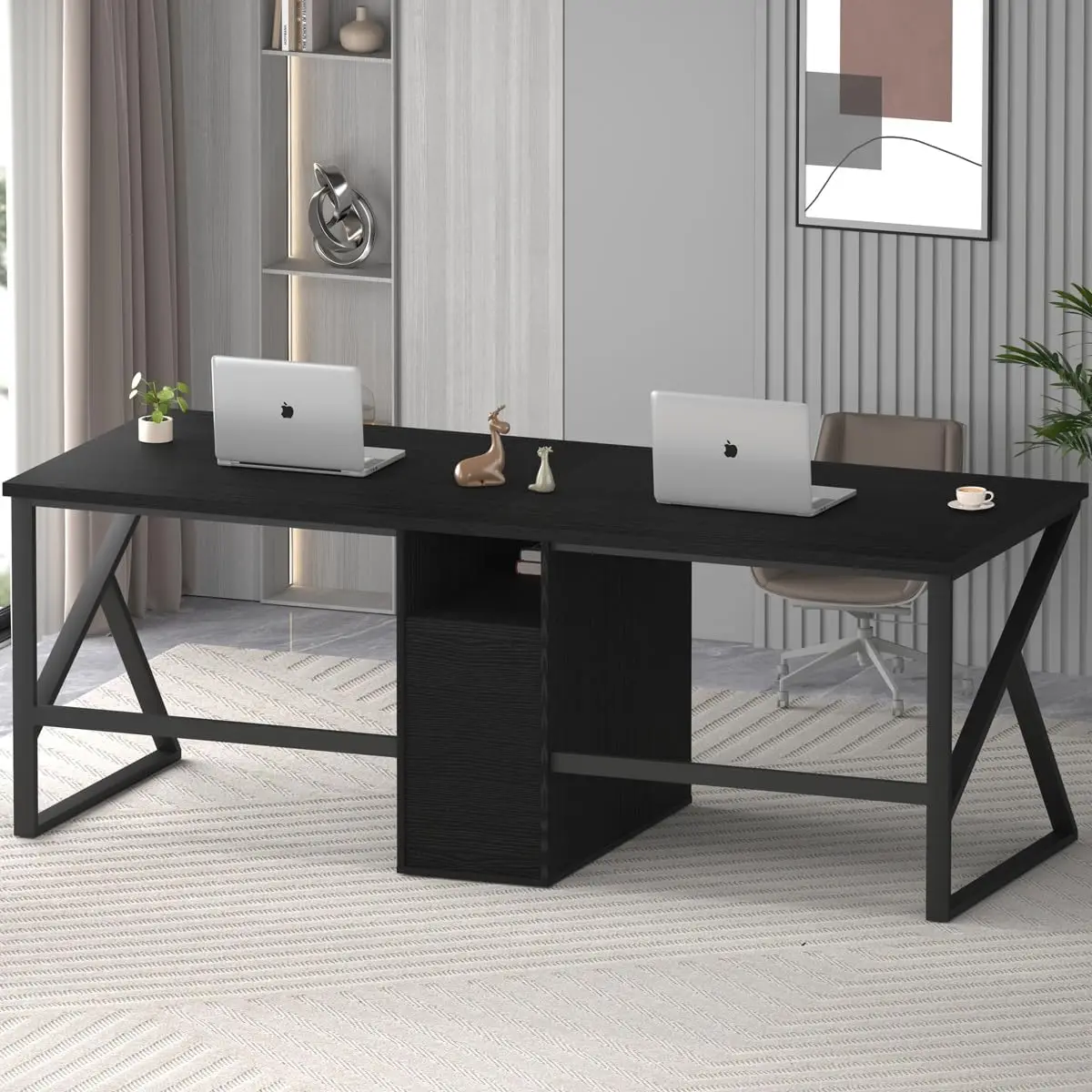 - [Superior Stability] – This double two person desk made from heavy-duty metal, this modern dual desk offers exceptional stability and durability. Its thick desktop can support heavy loads, with a weight of about 81.0 lbs and a high capacity of nearly 550 lbs. The foot pads not only prevent scratches on uneven surfaces but also provide height adjustment to meet your various needs.