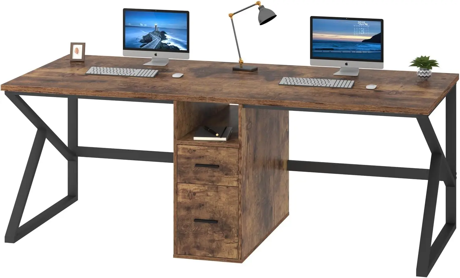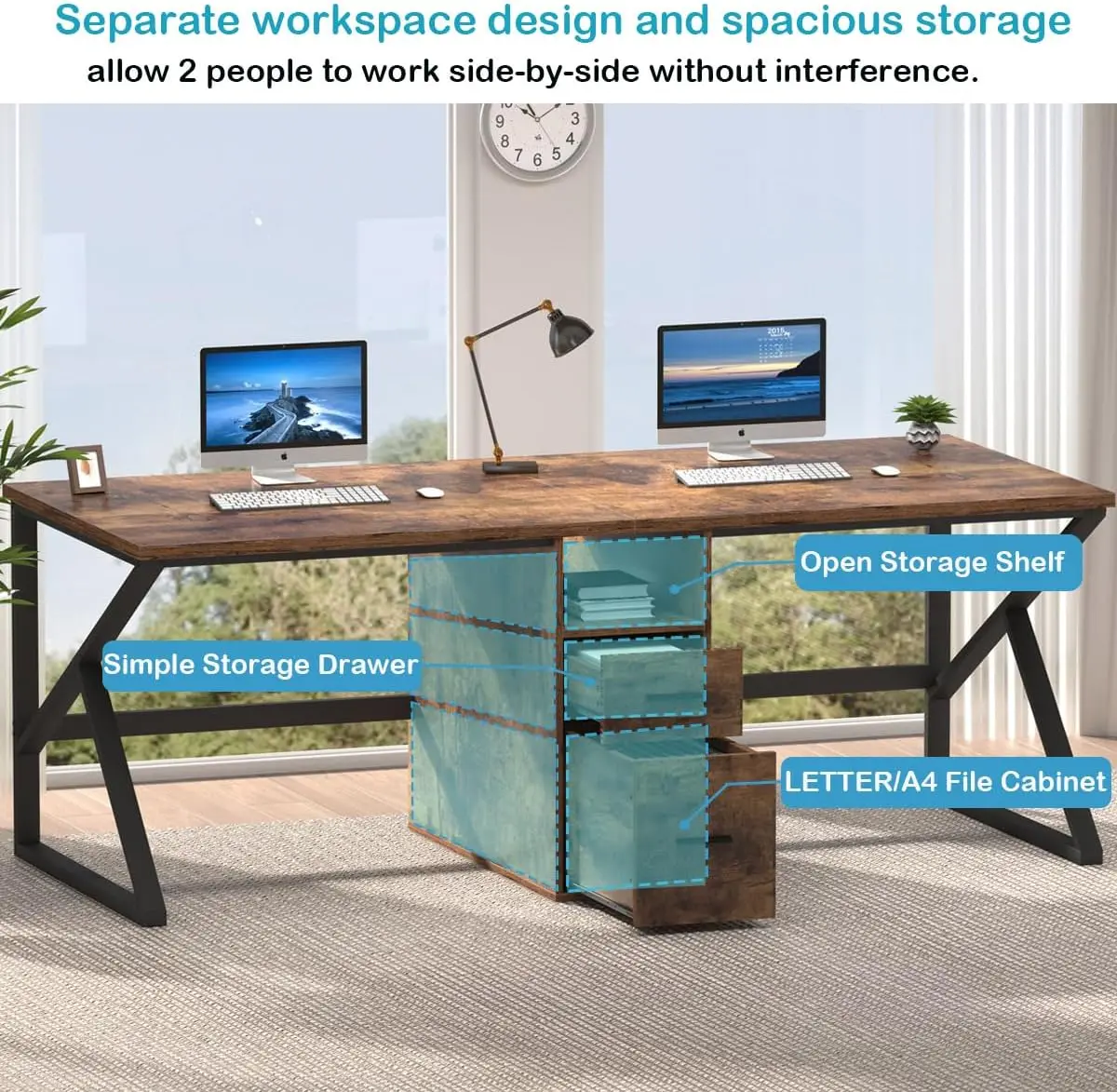 - [Spacious and Functional Desk with Ample Storage Space] – This two person desk features a large desktop surface with a storage shelf and file drawers, providing ample space to hold books, laptops, desktop PCs, and office accessories. The storage shelves can be used to store stationary, documents, books, files, plants, photos, and decor, making it suitable for various purposes such as a computer desk, writing desk, office desk, study table, meeting table, or exhibition table.