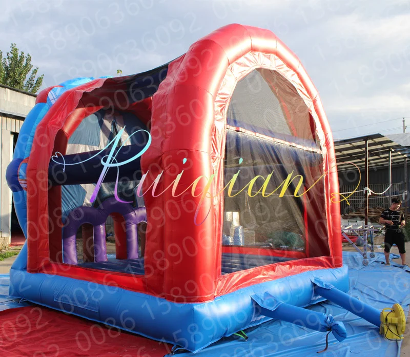 –It is very easy to install. Prepare your ground, open the packages of inflatables and air blower, unfold the inflatables, then connect the air blower with inflatable, turn on the electrictiy to inflate it