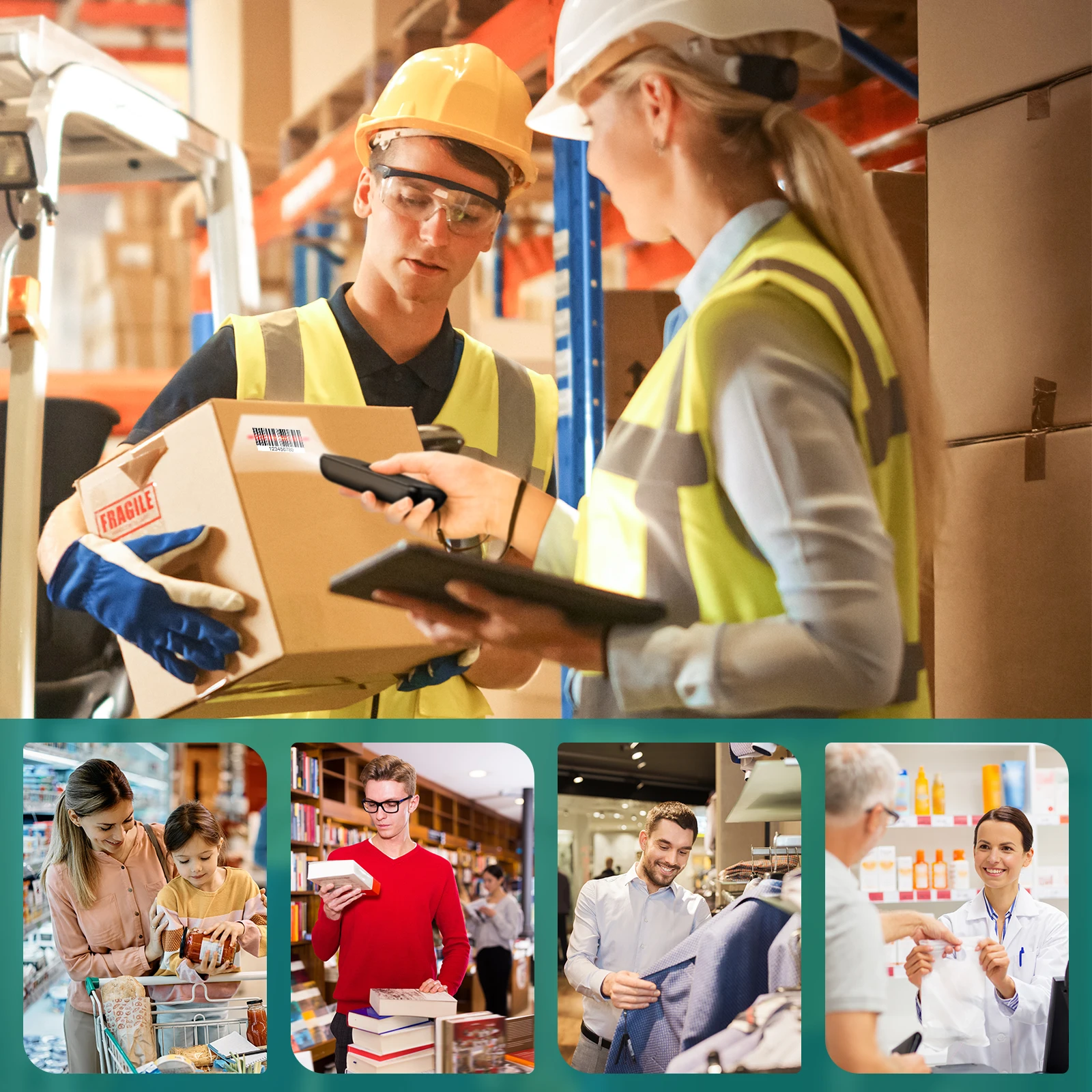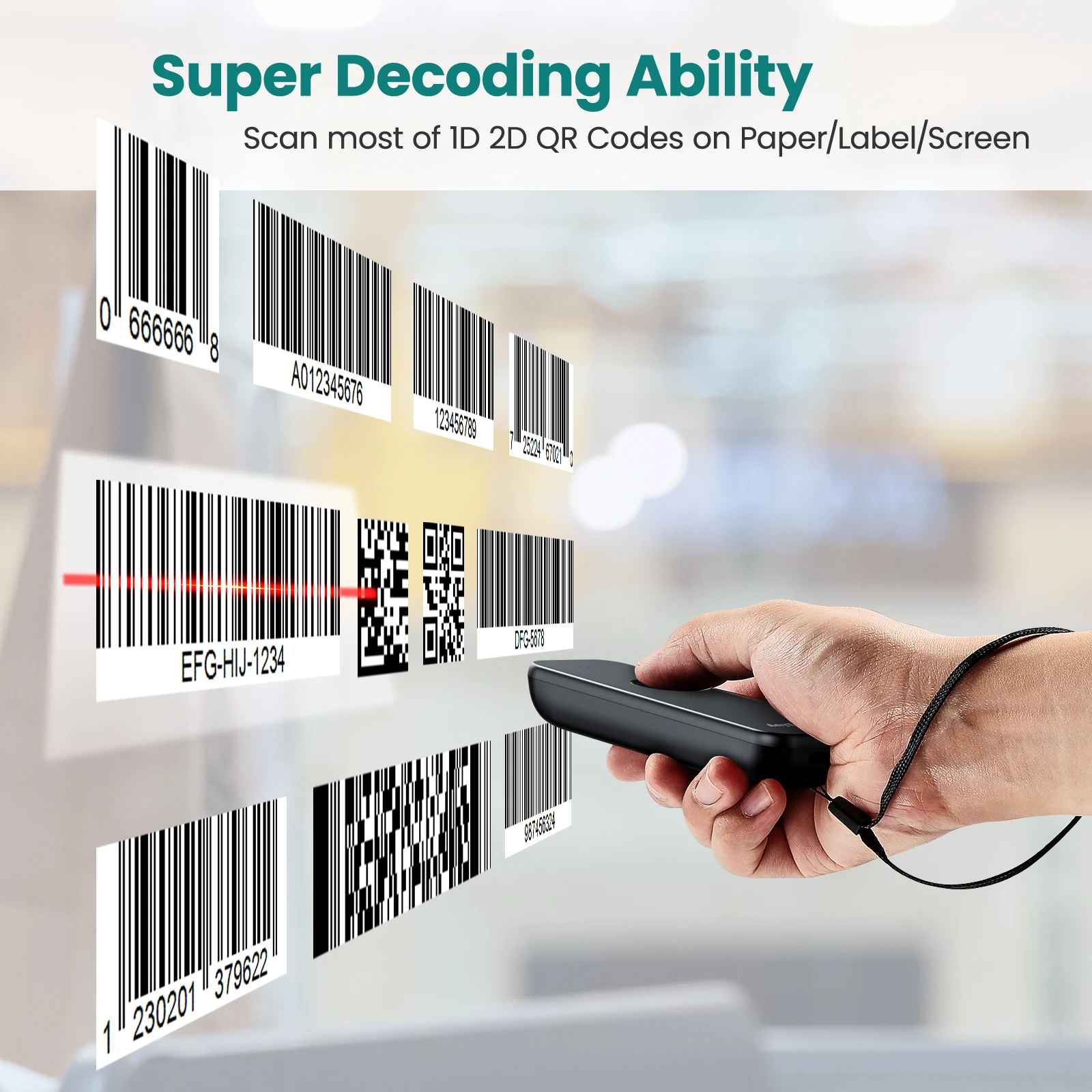 ✅【Advanced Scanning Technology】The bluetooth barcode scanner is equipped with an advanced CMOS sensor, can accurately decodes 2D 1D QR barcodes on labels, paper and screen. Like 1D: Code 128, Code39, EAN, UPC, ISBN, etc. 2D: QR Code, Micro QR Code, Data Matrix, PDF417. This QR code scanner can even recognize colorful/fuzzy/damaged/reflective/smudged barcodes.