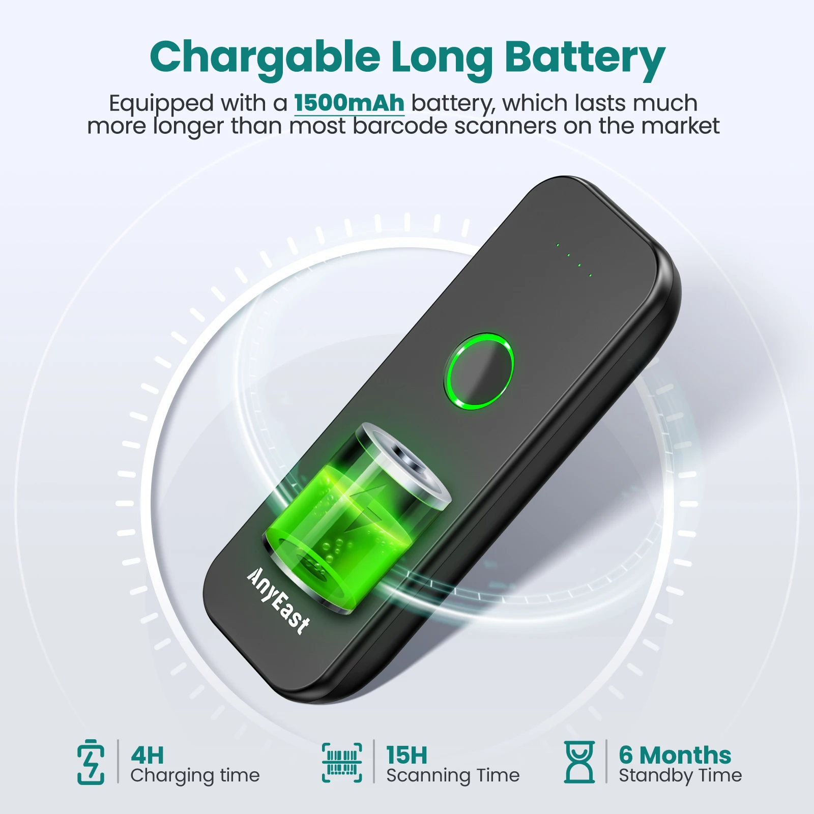 ✅【Pocket Size Achieve Ultralong Scanning Time】Anyeast wireless barcode scanner adopts a mini design weighs only 2.3oz, proper for recordinng data while doing other things. The 1500mAh battery achieves 15 hours continuous scanning time, this 2D barcode scanner is a preferred work companion for your sales shop, bookstore, library, pharmacy, clothing store, warehouse and logistics work.