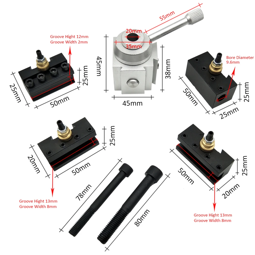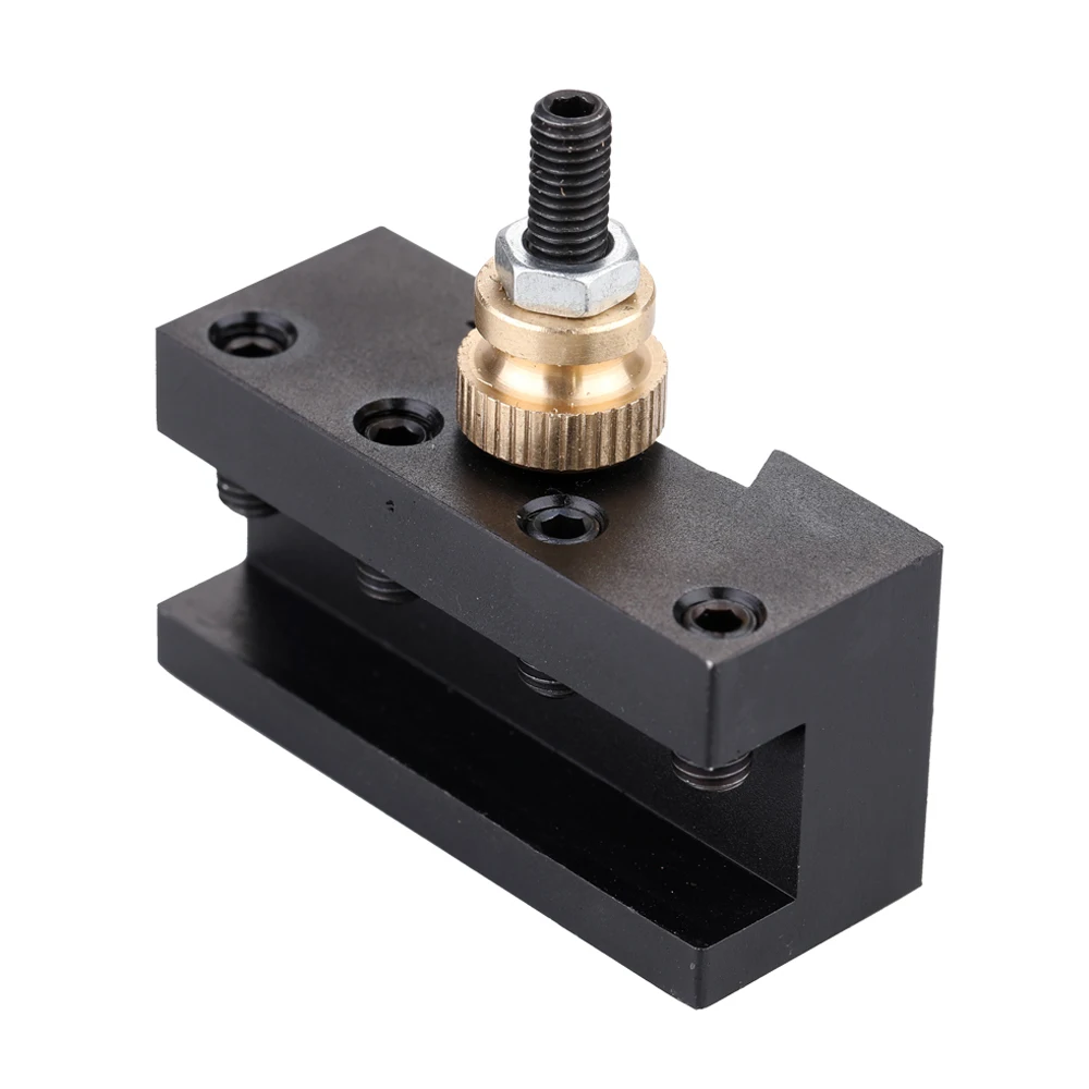 Upgrade your mini lathe with this quick change tool holder. This professional lathe post and holder kit is designed for cutter holder on an ordinary lathe. It consists of a tool post and several toolholders that can be adjusted based on the machining requirements. Whether you need to work on the lathe outside garden, end face cutting, knurling, drilling, boring, reaming, this tool holder is versatile and essential for precise machining.