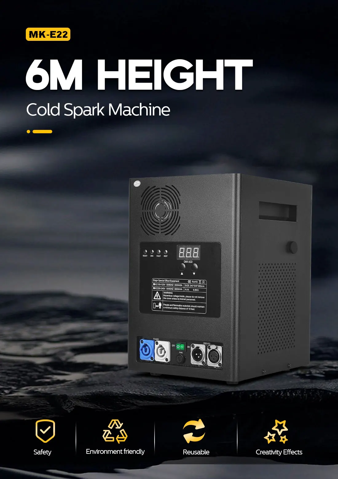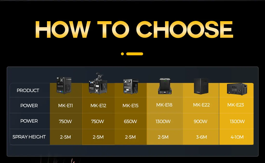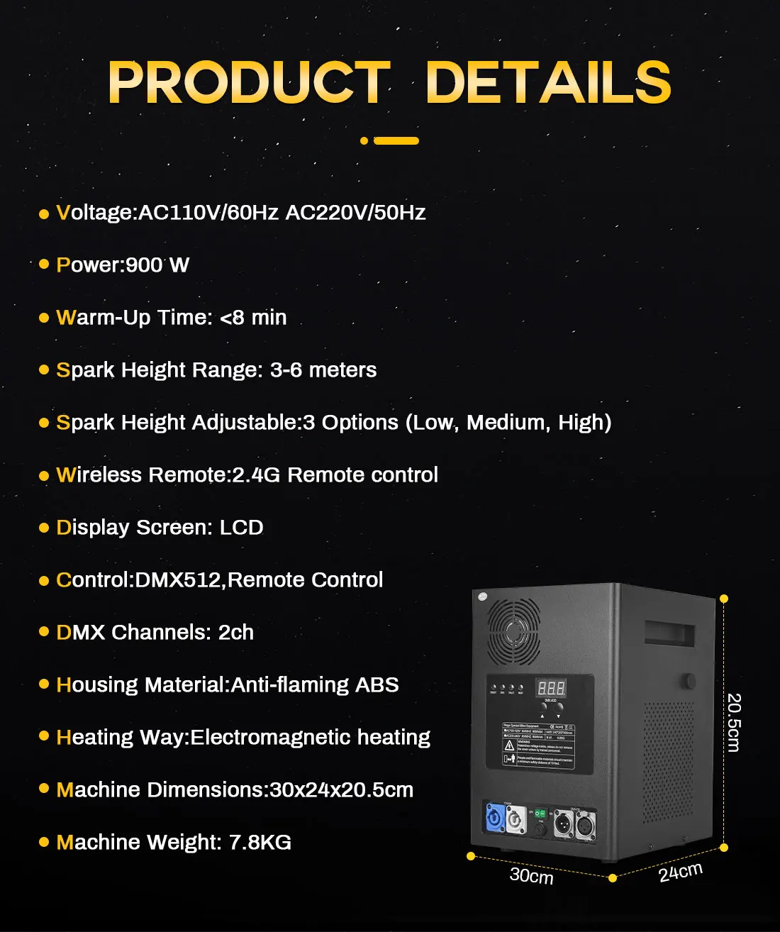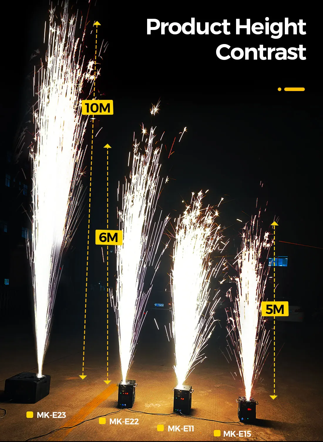 We wanted a compact size and weight, without compromising the build quality, safety, & volume of the sparkler show. These units are a smaller version of the original cold spark machines and the sleek design is self-contained inside a small black ABS box. These spray higher (3-6 meters) than most units currently on the market (2-5meters). They produce very little to no smoke and produce no odor, which is almost unheard amongst the Cold Sparkler industry. The granules used in these machines have no explosive content. It is also self-cleaning, so there is no mess afterward. This machine is fully programmable and easy to set up., you have the ability to control the height and duration of the sparkler display.