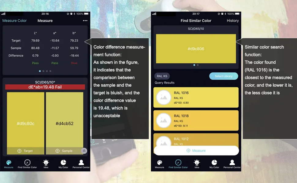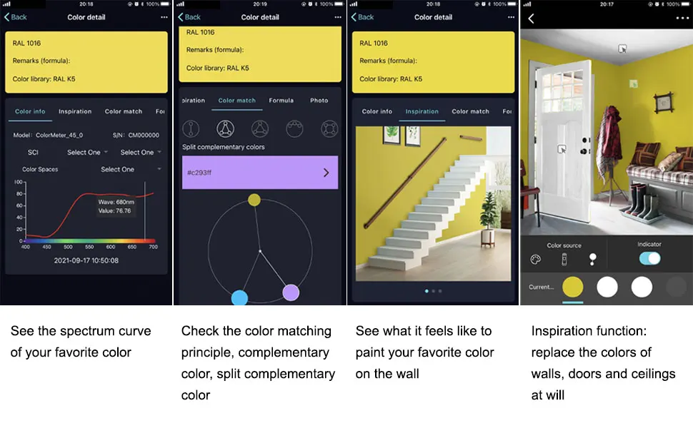 This is a colorimeter and a spectrophotometer, which can measure CIE-Lab,CE-LCh,XYZ,Yxy,RGB,CMYK and other parameters. It can also identify two color differences, judge whether they are qualified or not,and tell you the color bias, such as "more red less green". It can measure a color, find the color card number closest to the color, or establish its own color database. It has the function of color inspiration to help you match your favorite colors at will. Whether you are an interior designer, painter or just want to paint your home, she is your very clever color measuring tool.