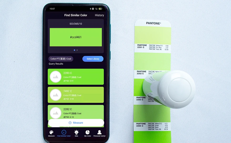 This colorimeter has three built-in electronic color cards: Pantone Uncoated, Pantone Coated, RAL K5. You can measure any color with a colorimeter to match the color card number closest to it. If you have other paper color cards, you can also move them to the APP. The operation is very simple.
