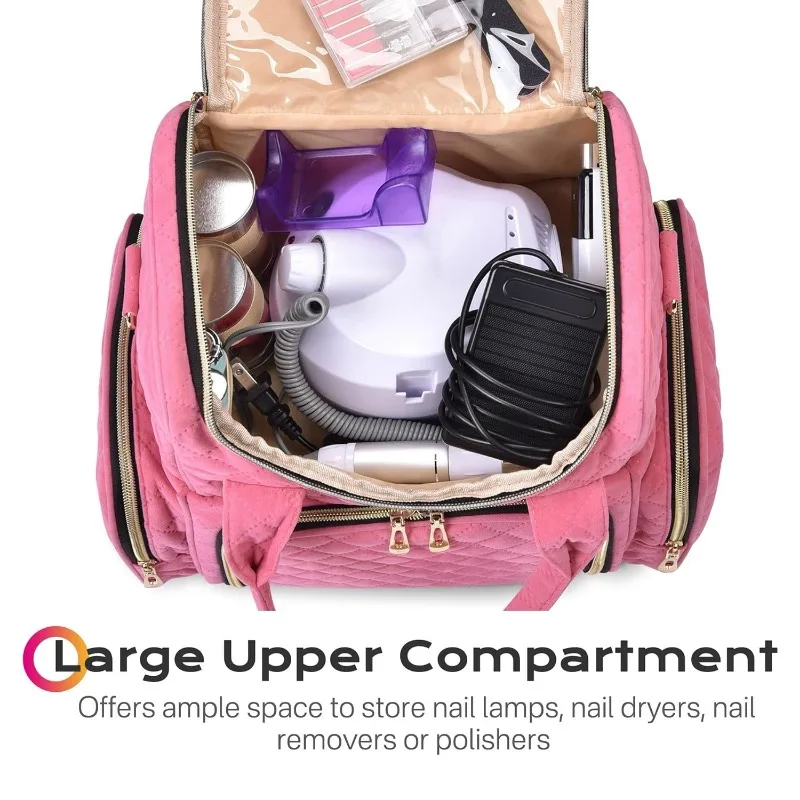 - [Customizable Makeup Case]: Features a top section with 54 slots and a drawer with dividers for organizing nail polishes and accessories, and bottom section with 6 extendable trays for sorting cosmetics; Detachable top case with handle & shoulder strap for using as a portable train case, along with transparent lids for fully displaying of your colorful nail polishes