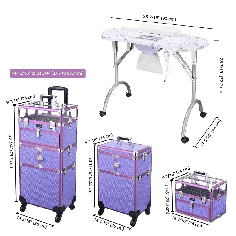 - [Manicure Table & Makeup Case Kit]: Includes 1pc foldable manicure table and 1 pc 2-in-1 purple makeup rolling case, a perfect kit for professional manicurists and nail art lovers to build up their mobile nail art workstations and fulfill their storage needs of nail tools and cosmetics while travelling, ideal for on-the-go nail artist, makeup artists, temporary make-up room, salon, etc.
