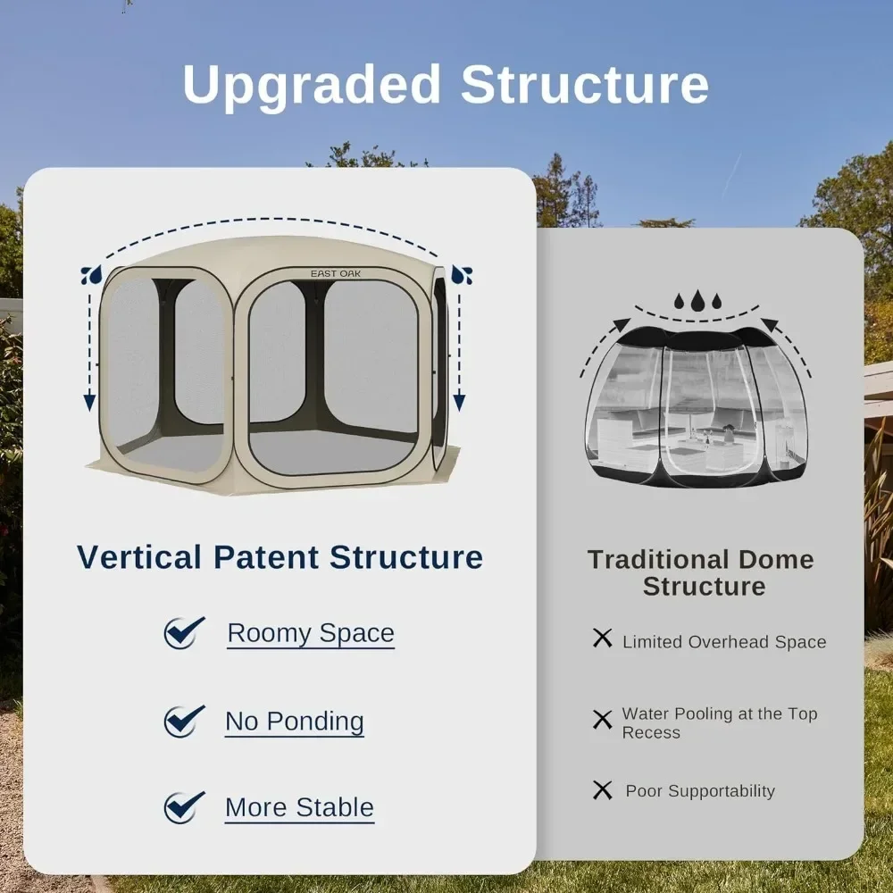 - 𝗥𝗼𝗼𝗺𝘆 𝗦𝗽𝗮𝗰𝗲& 𝗨𝗽𝗴𝗿𝗮𝗱𝗲𝗱 𝗗𝗲𝘀𝗶𝗴𝗻 : This screen room frame is made of durable 300D Oxford fabric and rust-resistant steel structure. The top is supported by fiberglass, which prevents water from accumulating and ensures more space. The zipper can be used on both sides, and its connection with the tent is upgraded with double stitching, making it less likely to tear. The door curtain can be fixed to the side for easy access. Strict control of details ensures product quality.