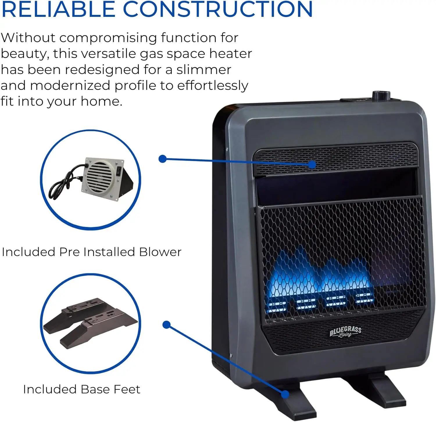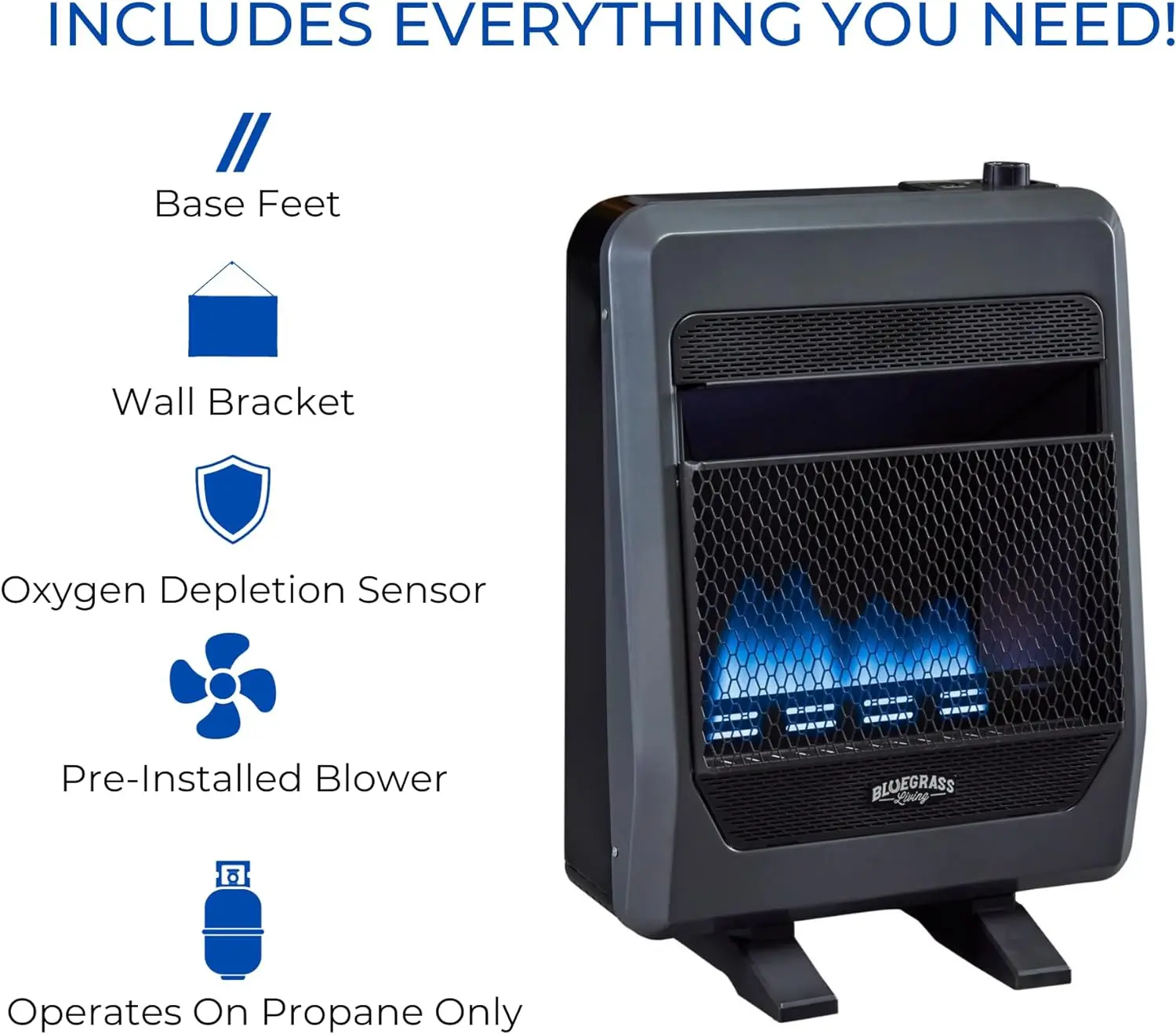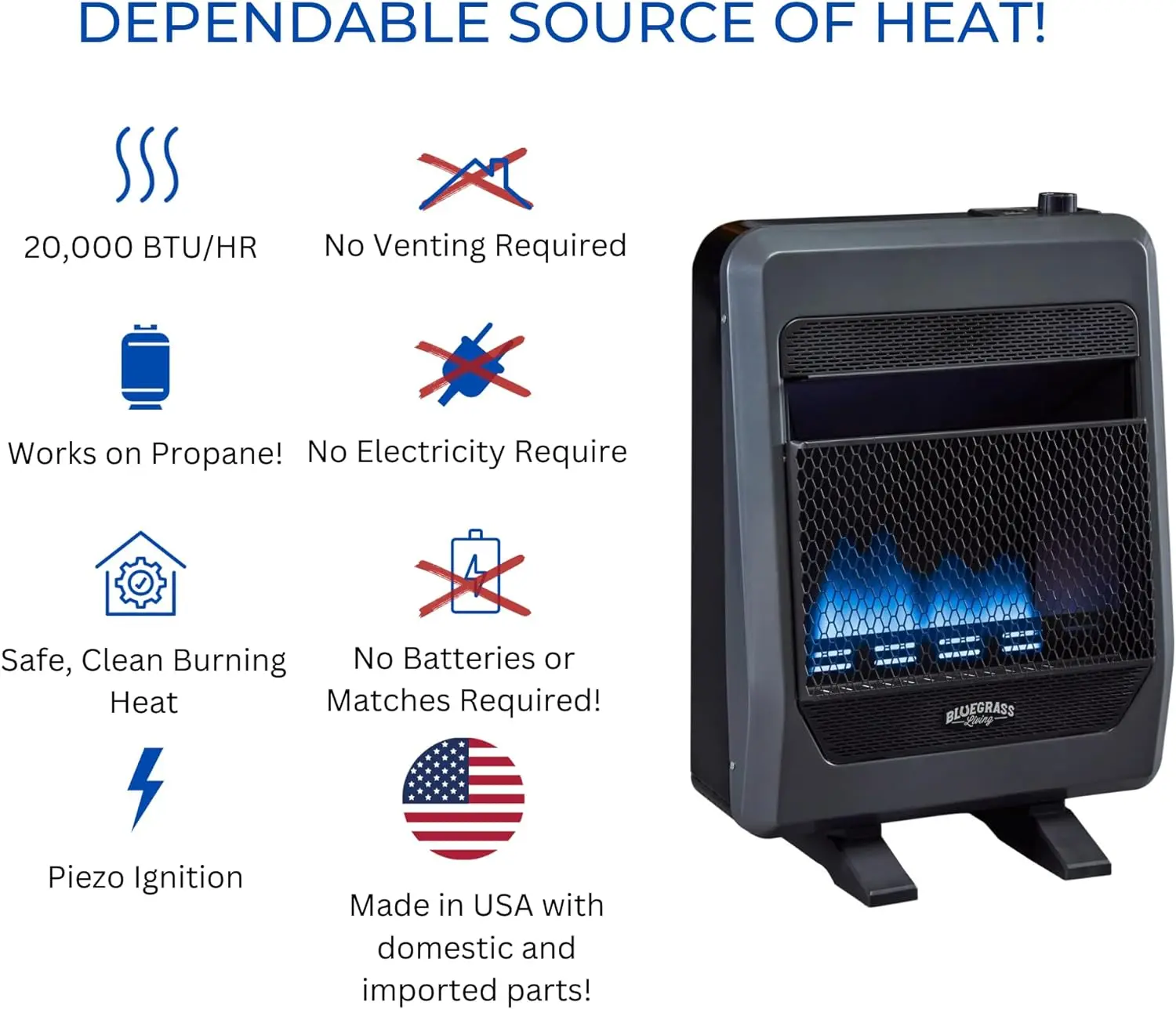 - TECHNOLOGY: This compact Blue Flame mini heater produces 20000 Maximum BTU using Liquid Propane and heats up to 950 sq. ft. area; This is a great heater for office, bedroom, living room, and other residential use