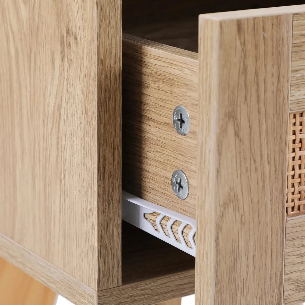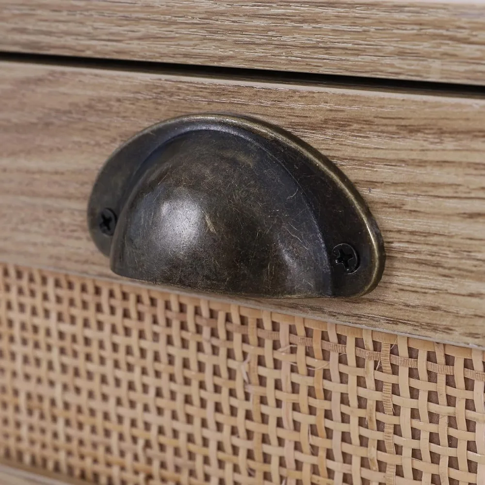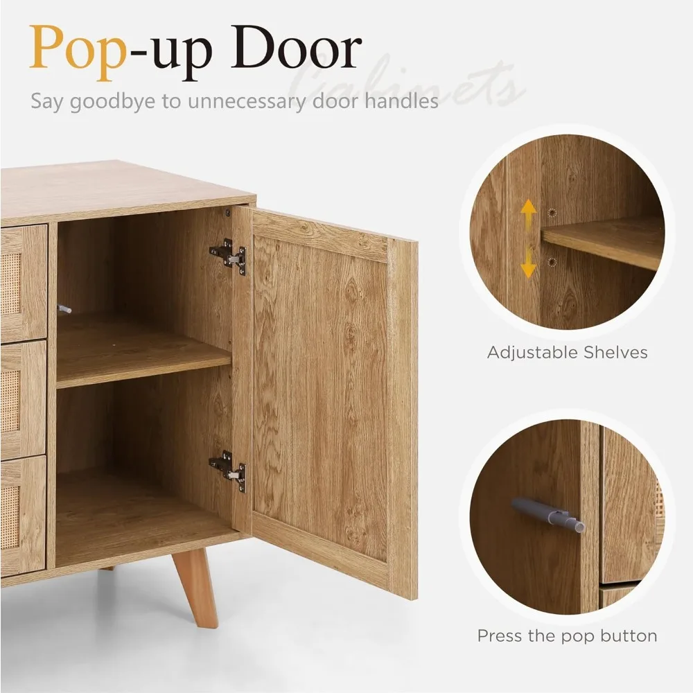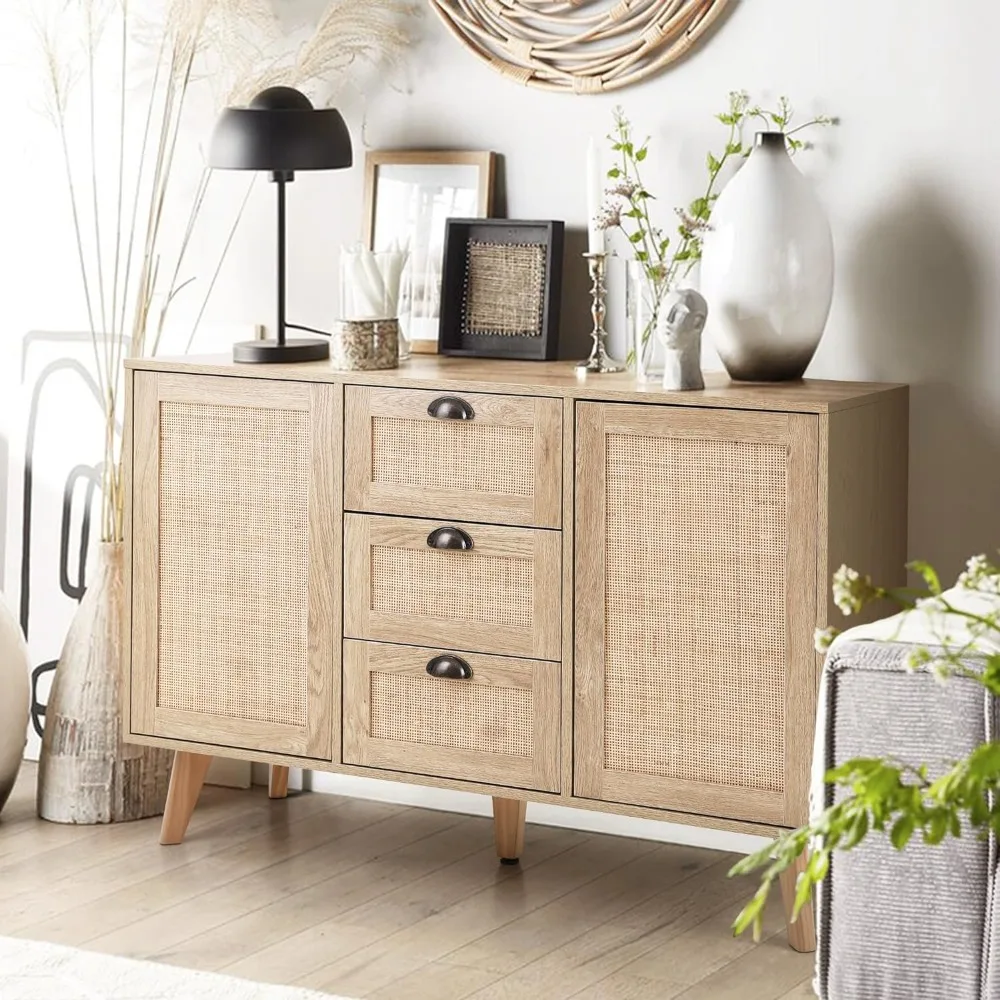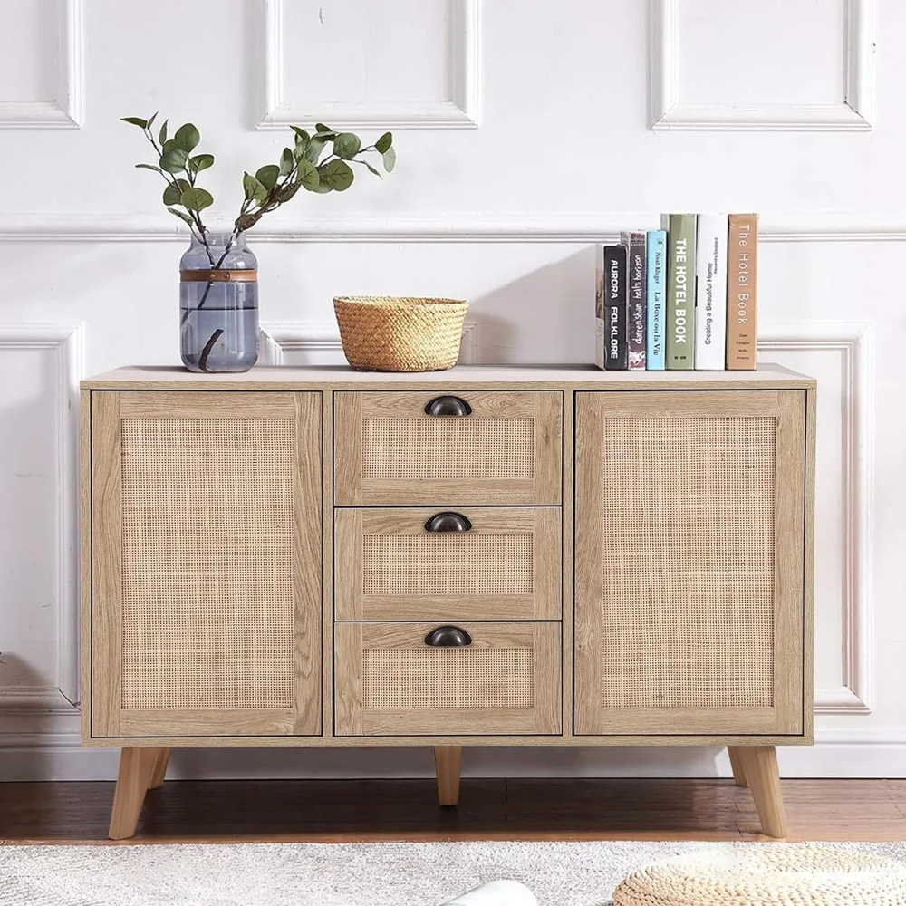 This content describes a rattan cabinet with adjustable shelves, doors, and drawers, suitable for use in dining rooms or living rooms. The cabinet provides ample storage space for various items such as dinnerware, glassware, or other household items. The adjustable shelves allow for customization of the interior storage space. This sideboard buffet storage cabinet offers both functionality and style, with its rattan material adding a touch of natural flair to any room. Perfect for organizing and storing items while enhancing the decor of the space.
