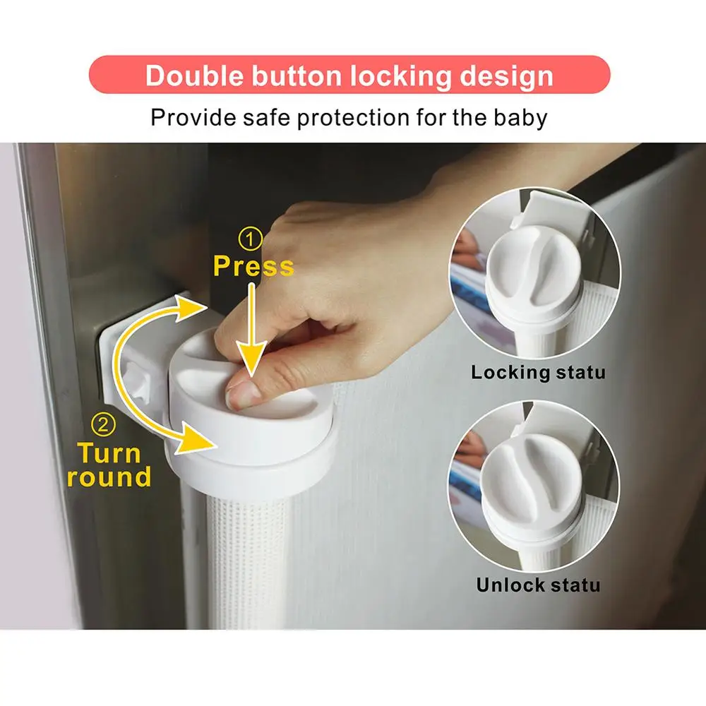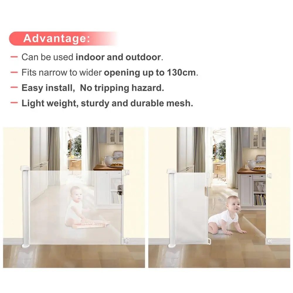 3. Telescopic design: The gate can be extended to about 51 inches wide and about 34 inches high. It can be adjusted according to any door/staircase width, up to about 51 inches. The net can be completely retracted when not in use, thus saving space.