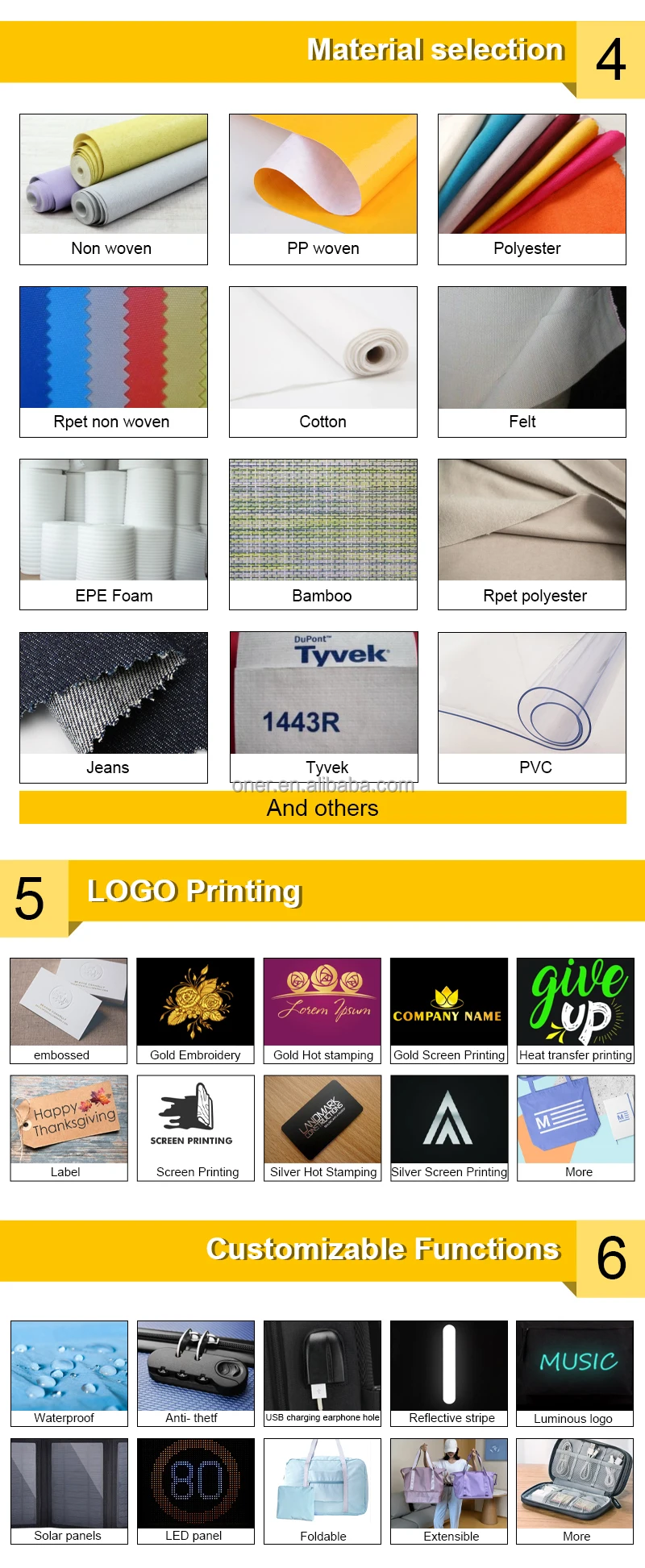 LOGO, Material, Size, Printing ,Handle, Ziper, Puller, Logo, Interior and other accessories