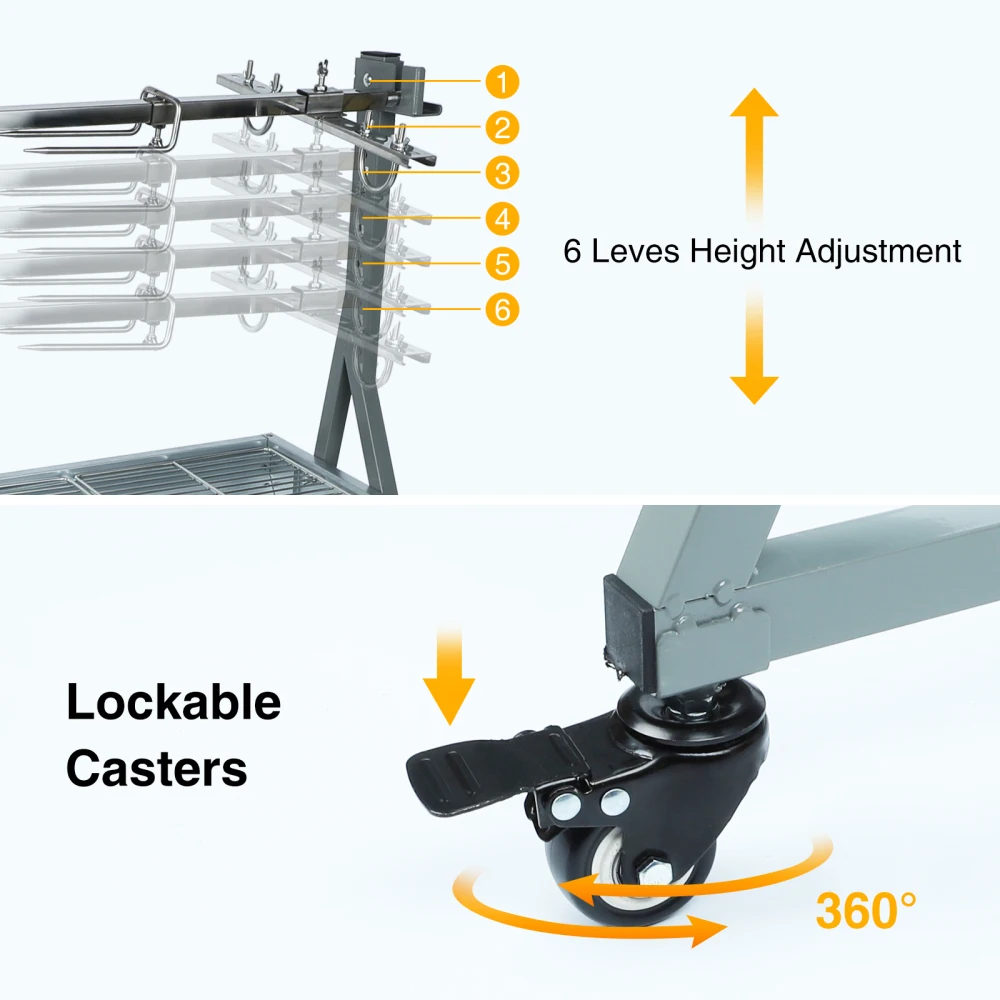🍗🍗FOUR-LEVEL HEIGHT ADJUSTMENT – Adjust the height of the rotisserie charcoal grill lamb roaster to meet the temperature requirements of different foods and prevent foods that are too hot from being burnt. After adjusting the height and position you