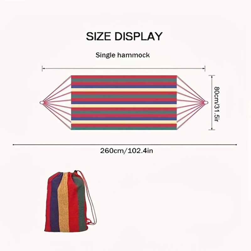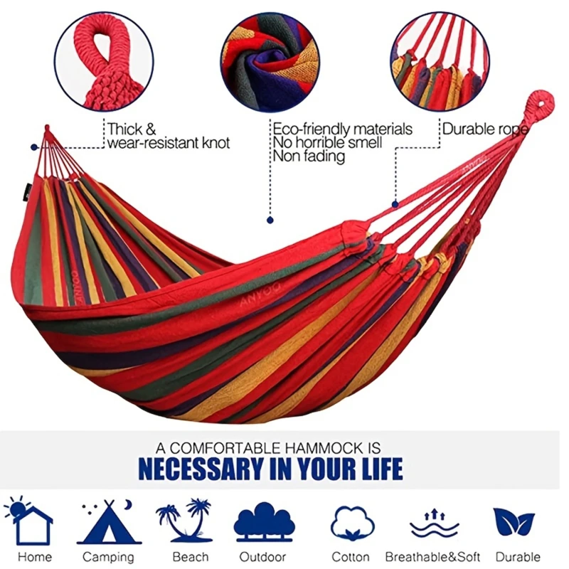 This is a single wide hammock made of thick canvas, suitable for outdoor camping or leisure activities. It is portable and can be easily packed in a backpack for traveling. It can be used as a sleeping bed or swing for relaxation. The hammock is durable and designed for outdoor use. Perfect for hanging between trees or using with a hammock stand. It provides a comfortable and secure place to relax while enjoying the outdoors. Ideal for camping trips, hiking, or simply lounging in the backyard. Overall, a versatile and convenient option for outdoor relaxation.
