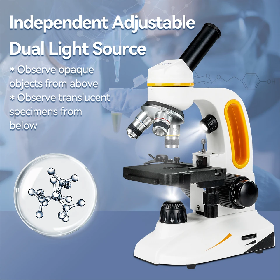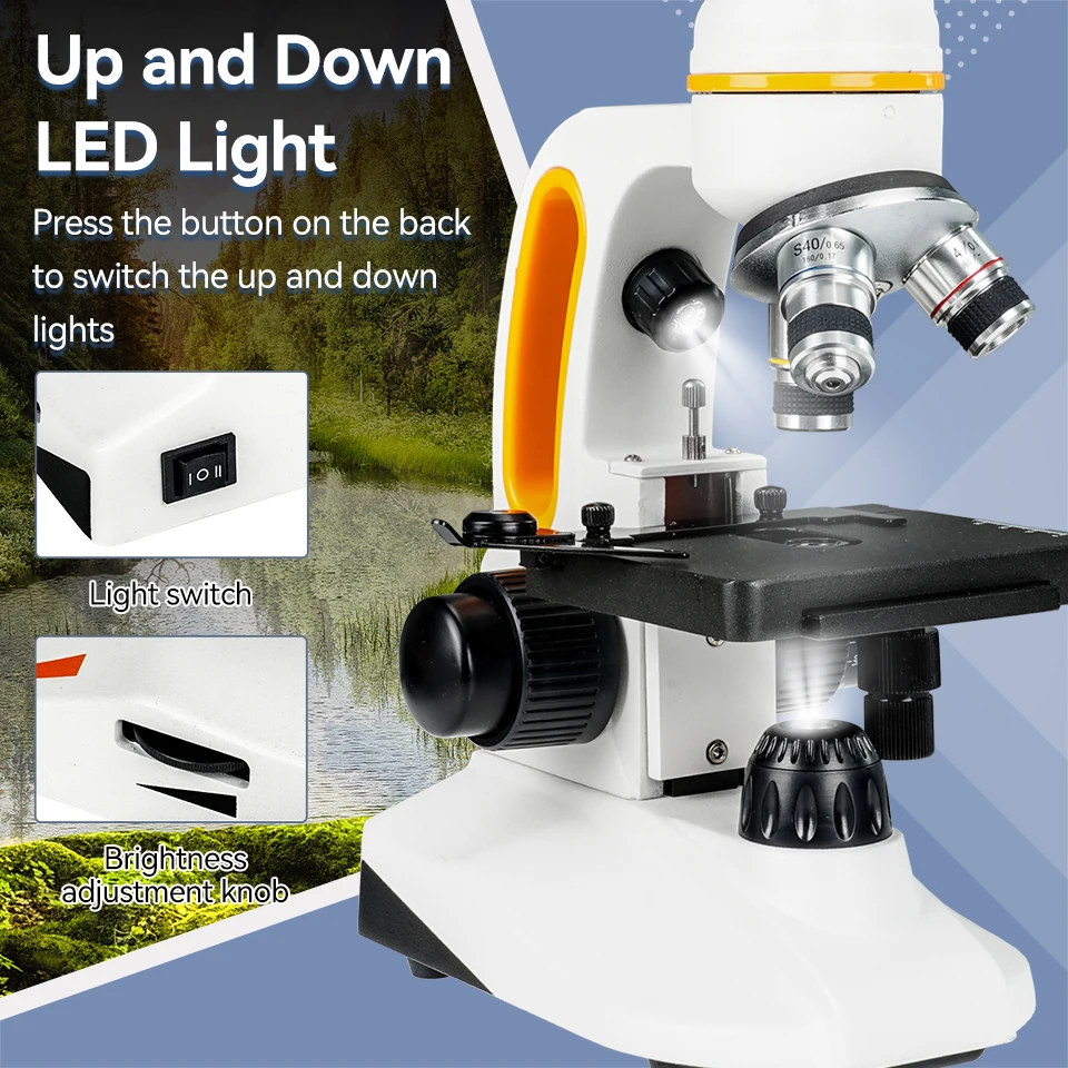 Up and down LED light; the monocular microscope can observe opaque objects illuminated from above; and also observe translucent specimens illuminated from below; you can use a dimmer switch to change the light intensity