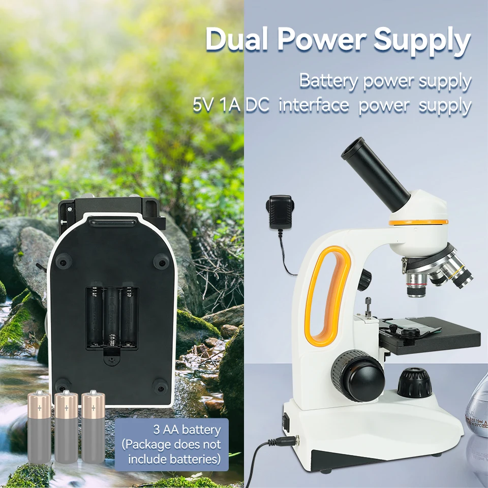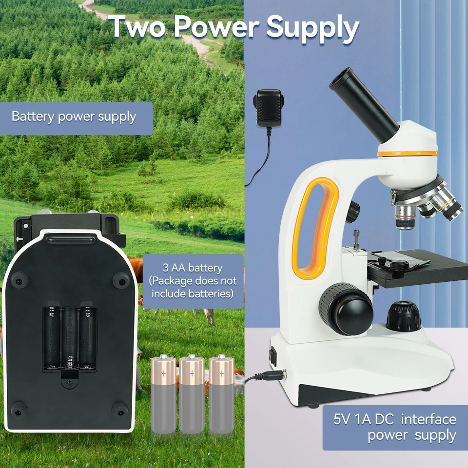 Dual power supply; the lab compound microscopes battery supports compartment and 5V1A DC interface