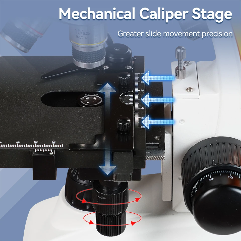 Mechanical caliper stage; the compound monocular microscope has greater slide movement precision; ensures the precision of movement when observing slides at 1000x-2000x high magnification