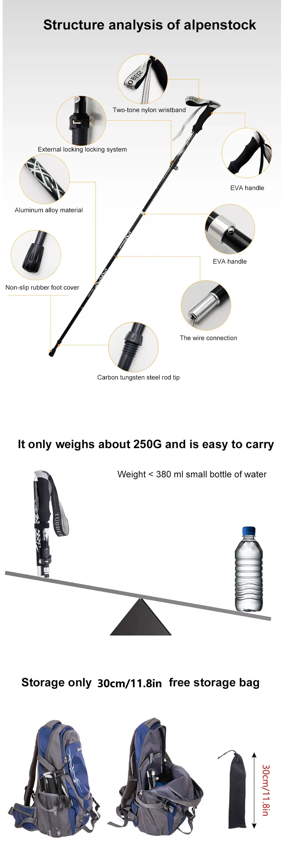 [Lighter Materials] WESTTUNE trekking poles shaft is made of durable aviation grade 7075 Aluminum, which is lighter than typical 6061 Aluminum and stronger than carbon fiber. It is lighter, increase traction and bear more weight in rugged terrains during hiking, camping and trekking.